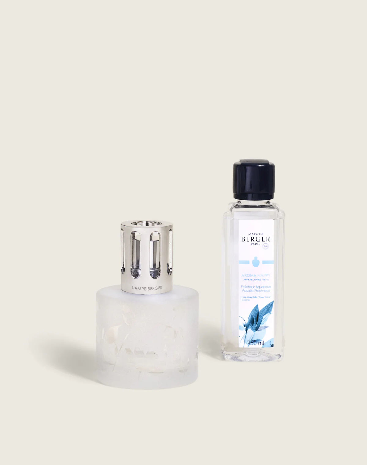 The Aroma Lamp Berger is an object of gentle simplicity: a rounded bottle in frosted white glass with a subtle, transparent floral decoration, and a discreetly elegant straight mounting to crown the whole.