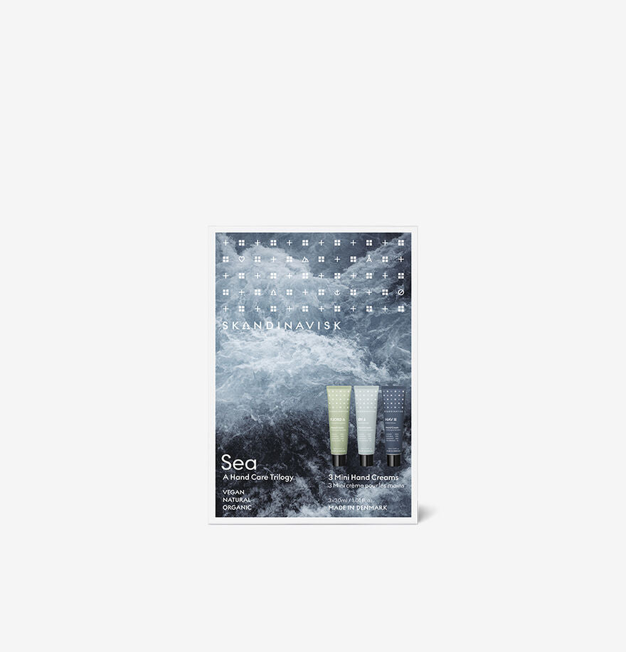 Our SEA Giftset contains one 30ml tube of each of our 3 mini hand cream fragrances: FJORD, ØY, and HAV.